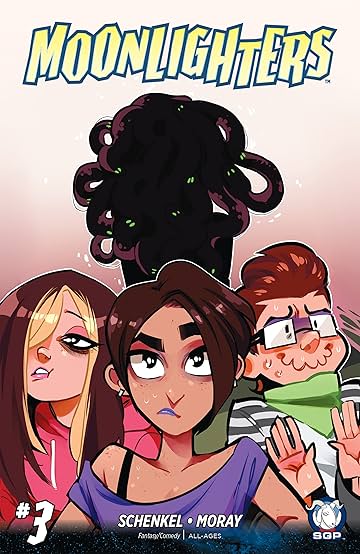 “Moonlighters” (Space Goat Productions) is a new comic written by Katie Schenkel, illustrated by Cal Moray. It talks about a girl who becomes a werewolf (Renee) and joins the Moonlighters team. In the third episode of the comic (digital release date: July 26, 2017) the team receives an order from Ms. Scaleson – it turns out that her dog Cerb is Cerberus and her daughter is Medusa!