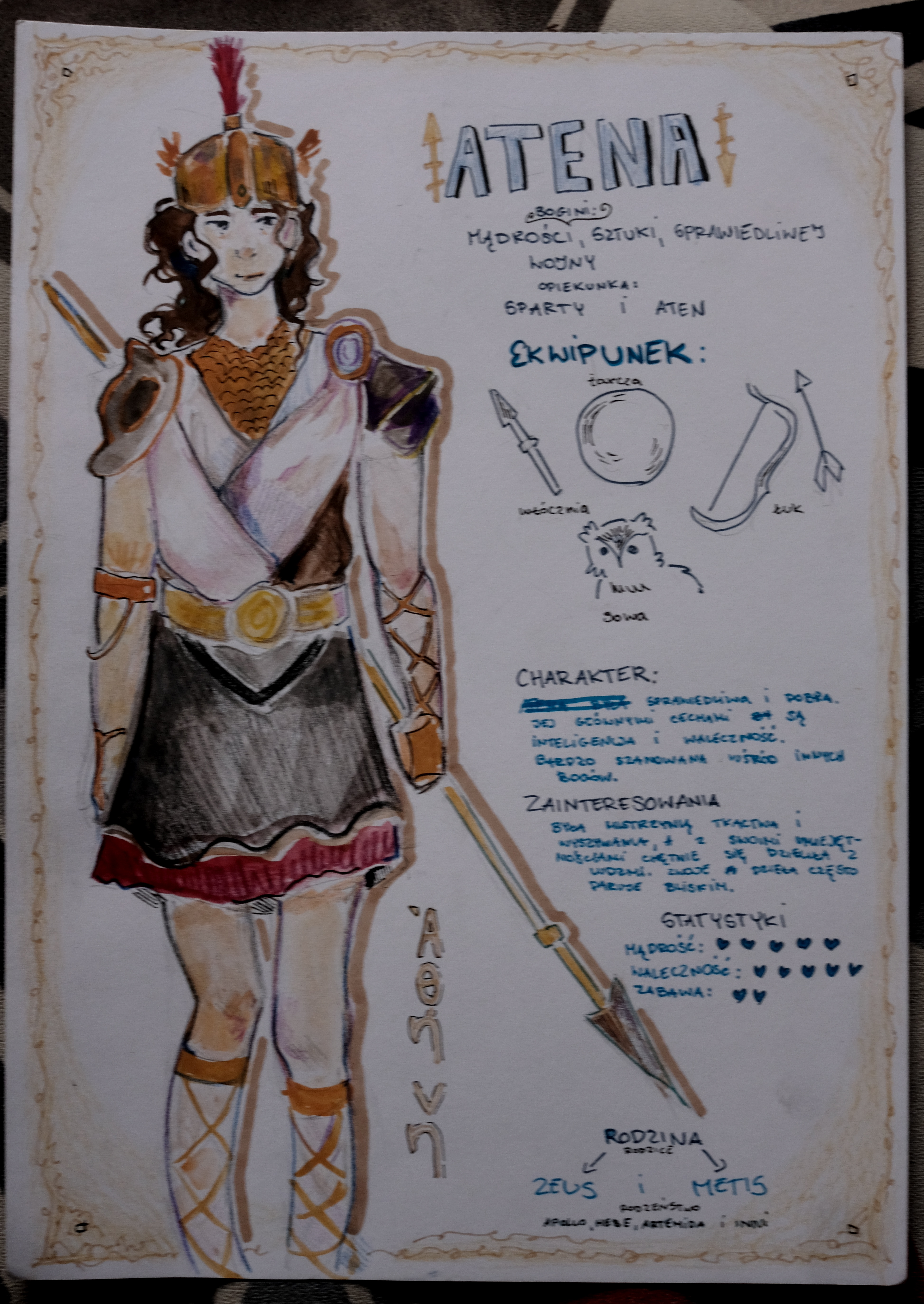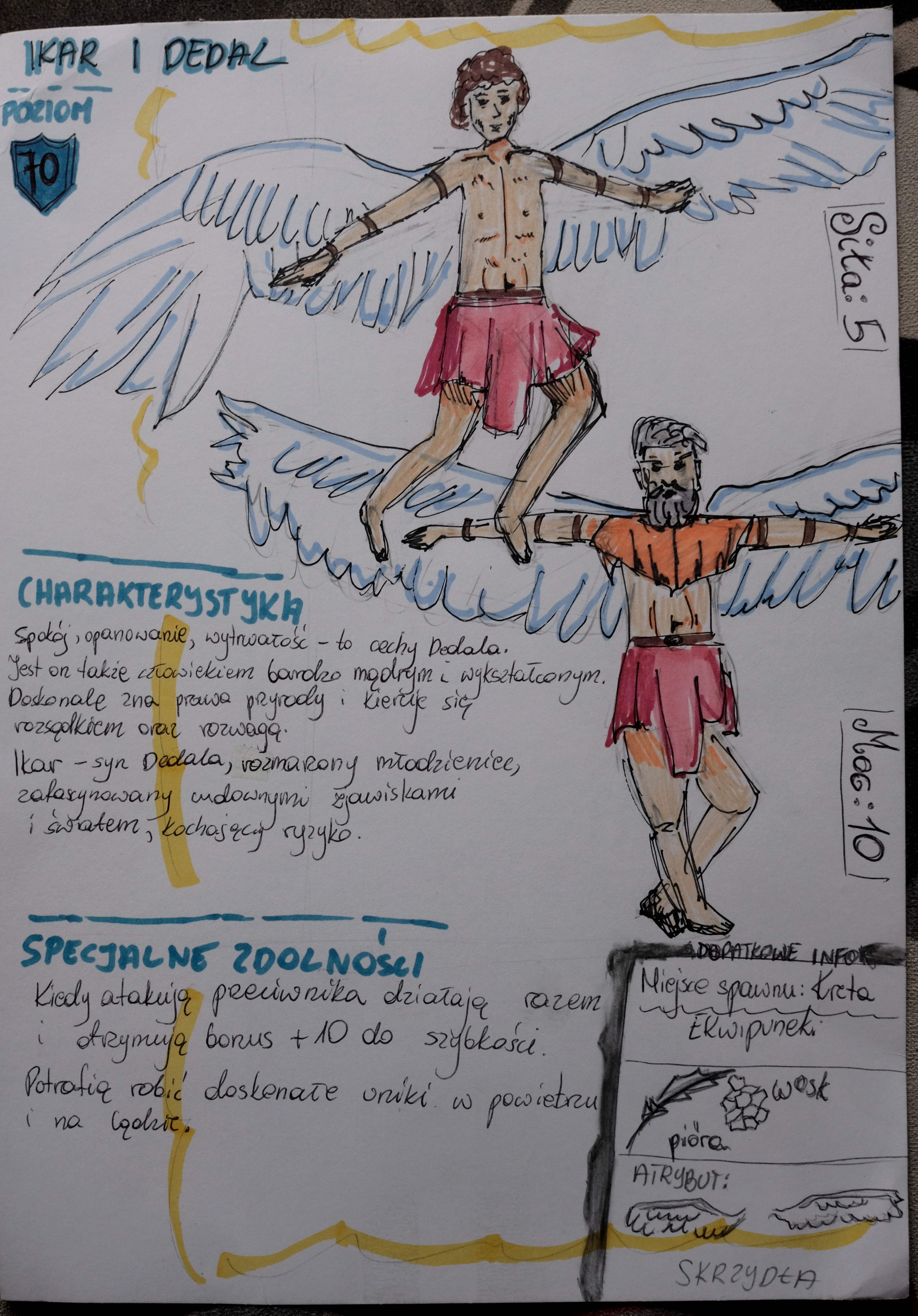 Kolejnym wyzwaniem było przygotowanie przez uczniów kart postaci wybranych przez siebie bohaterów – niektóre z nich można zobaczyć w załączonej galerii. Istotą zadania było przetworzenie informacji na temat omawianych postaci w atrakcyjnej i równocześnie znanej uczniom formie, kojarzonej z grami fabularnymi, w które wielu z nich grywa.