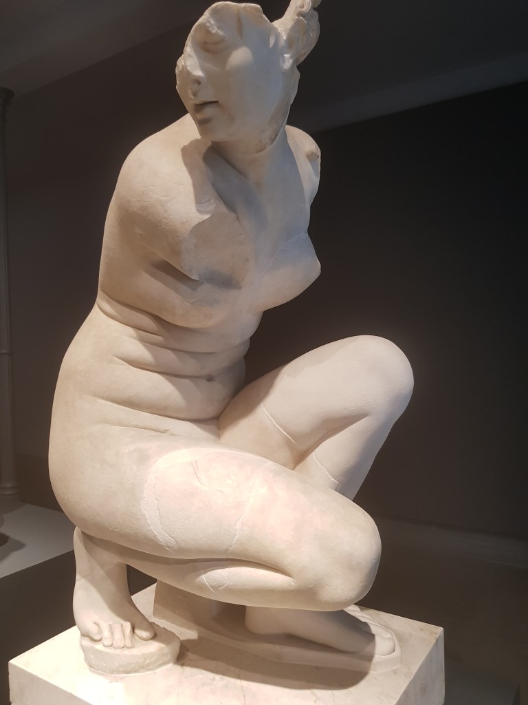 We find another statue which depicts a similar situation in the museum in Palazzo Massimo. However, in this version the naked goddess is crouching, not standing. As a result of bending, a few folds on the abdomen of goddess became visible which is something that we would not associate with the image of a perfect goddess of beauty. Thus, Venus from this kind of statues, imperfect, depicted in common situations, becomes somehow less distant for the ordinary people.