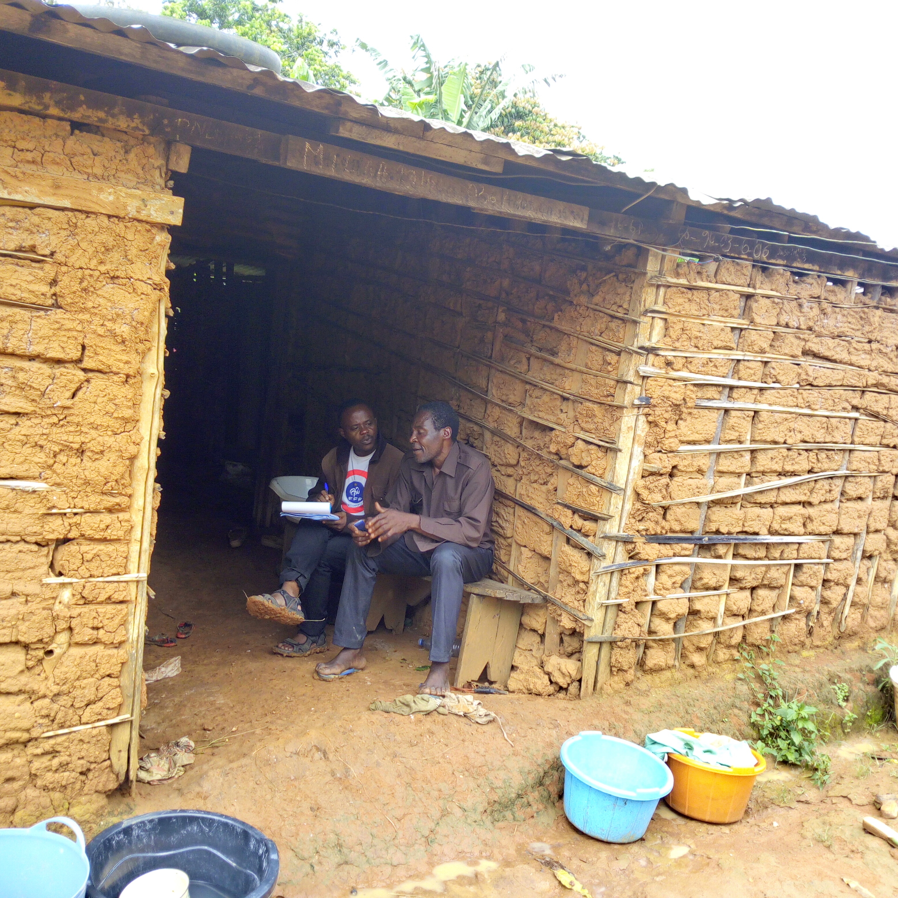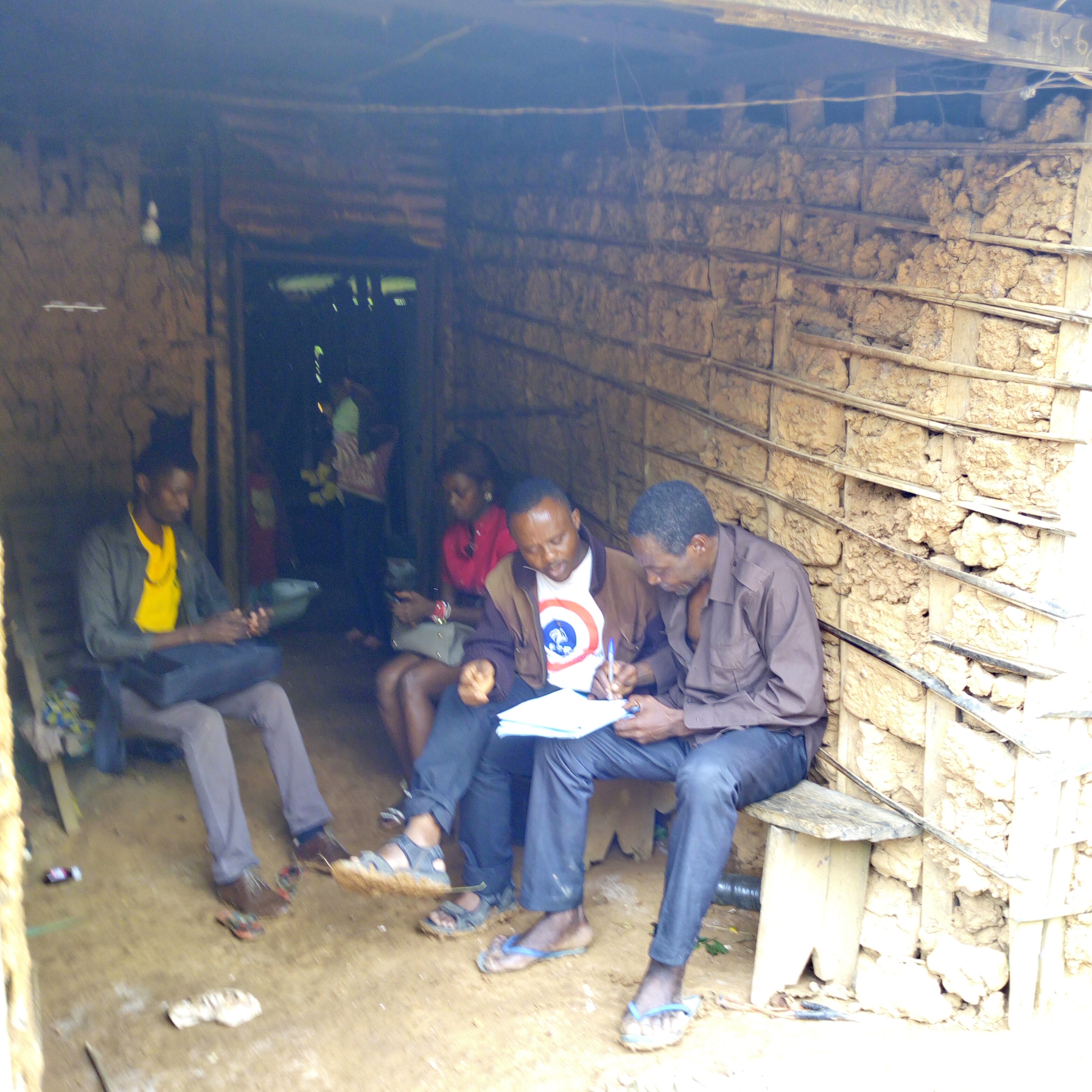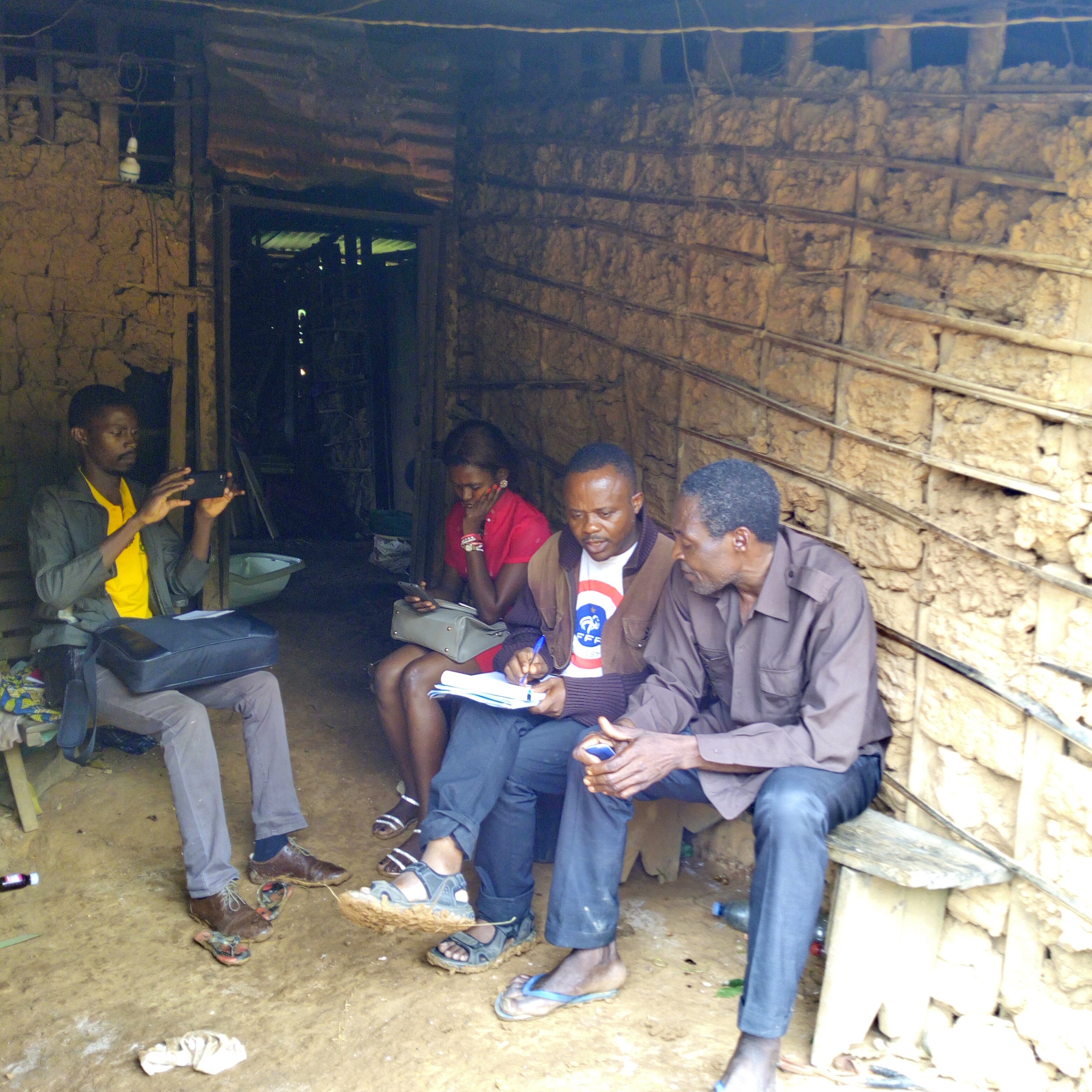 Photo 2: A myth narration event: Mr Ngah Zobo narrates his story as Daniel Nkemleke listens and takes note. Close to them are two participants who were interested in the narration.